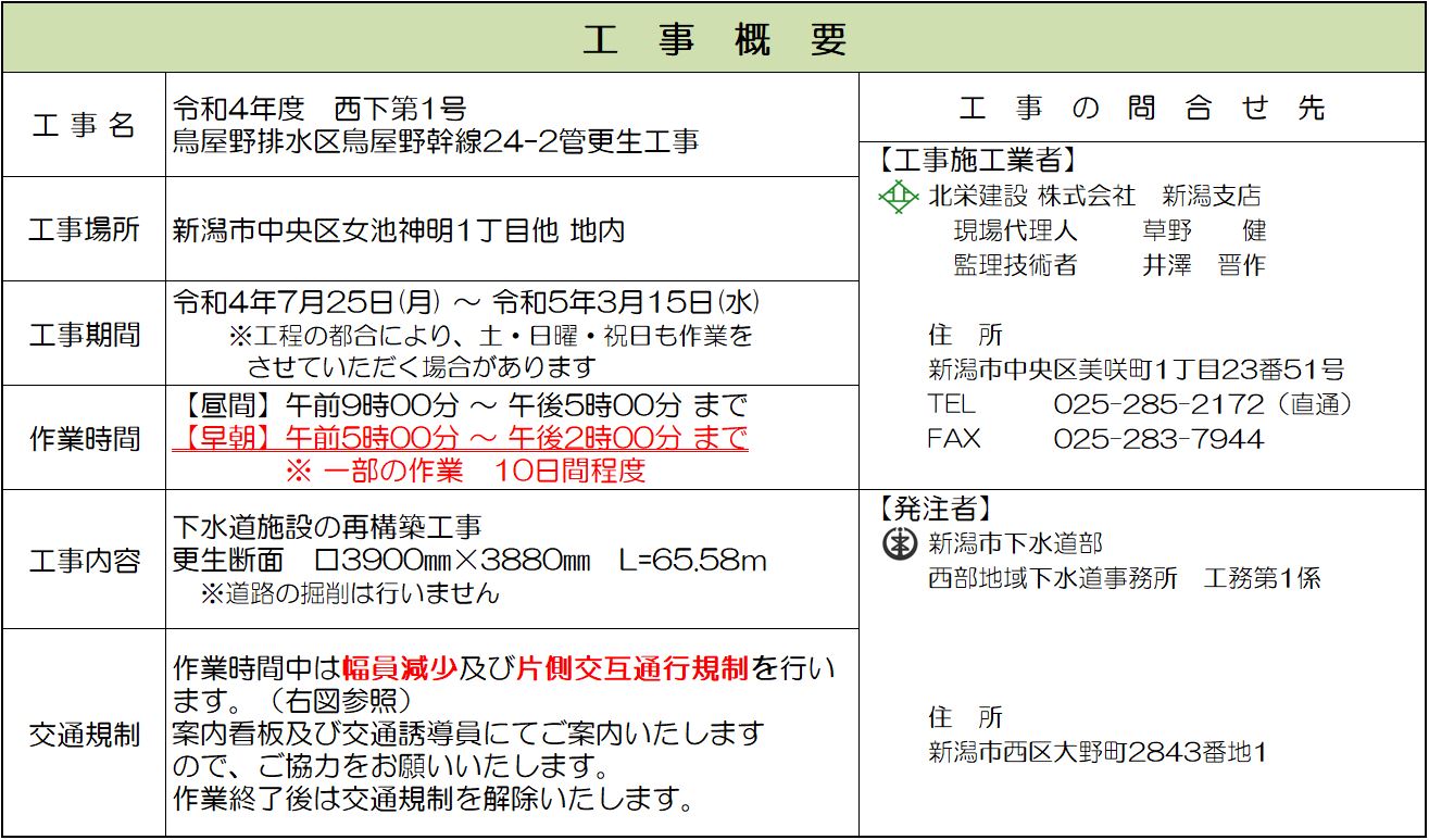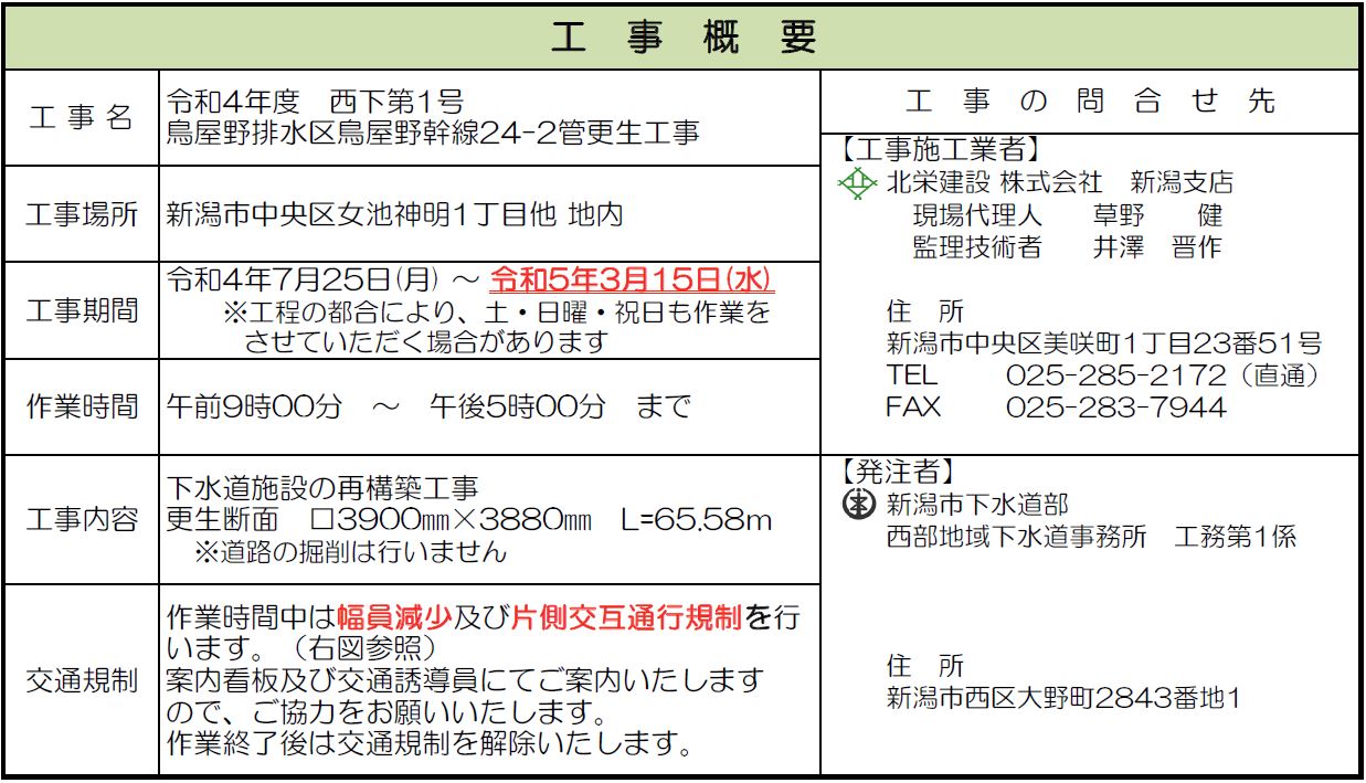 | 規制形態 | 幅員減少及び片側交互通行 作業時間中は案内看板及び交通誘導員にてご案内いたしますので、 ご協力をお願いいたします。 作業終了後は交通規制を解除いたします。 |