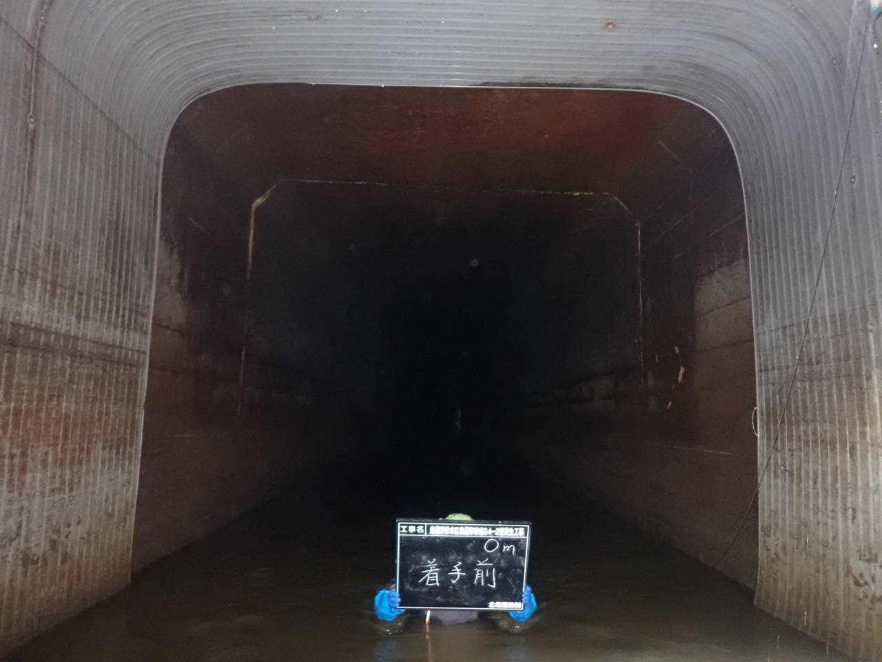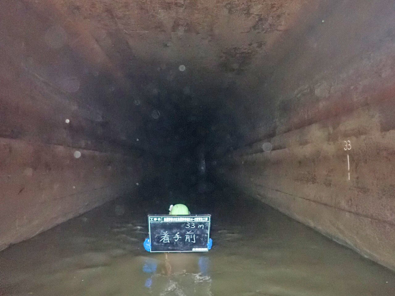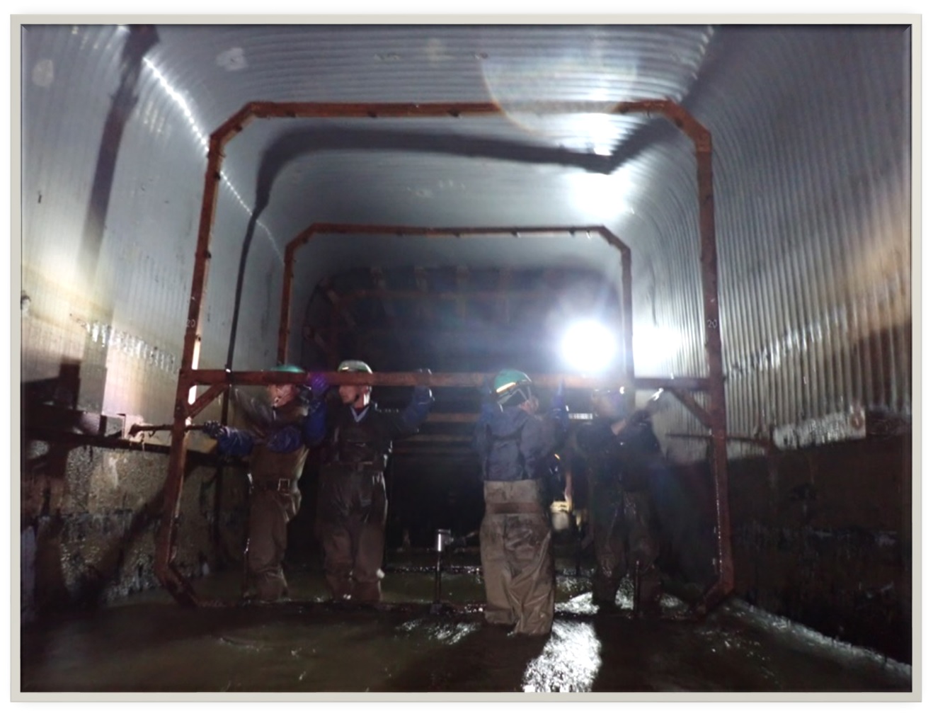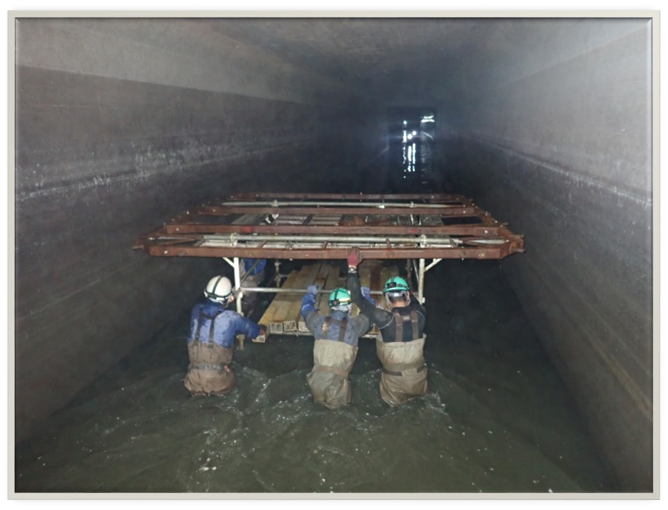 水が流れている管内での作業で足元がとても不安定ですが慎重な作業を心掛けています。