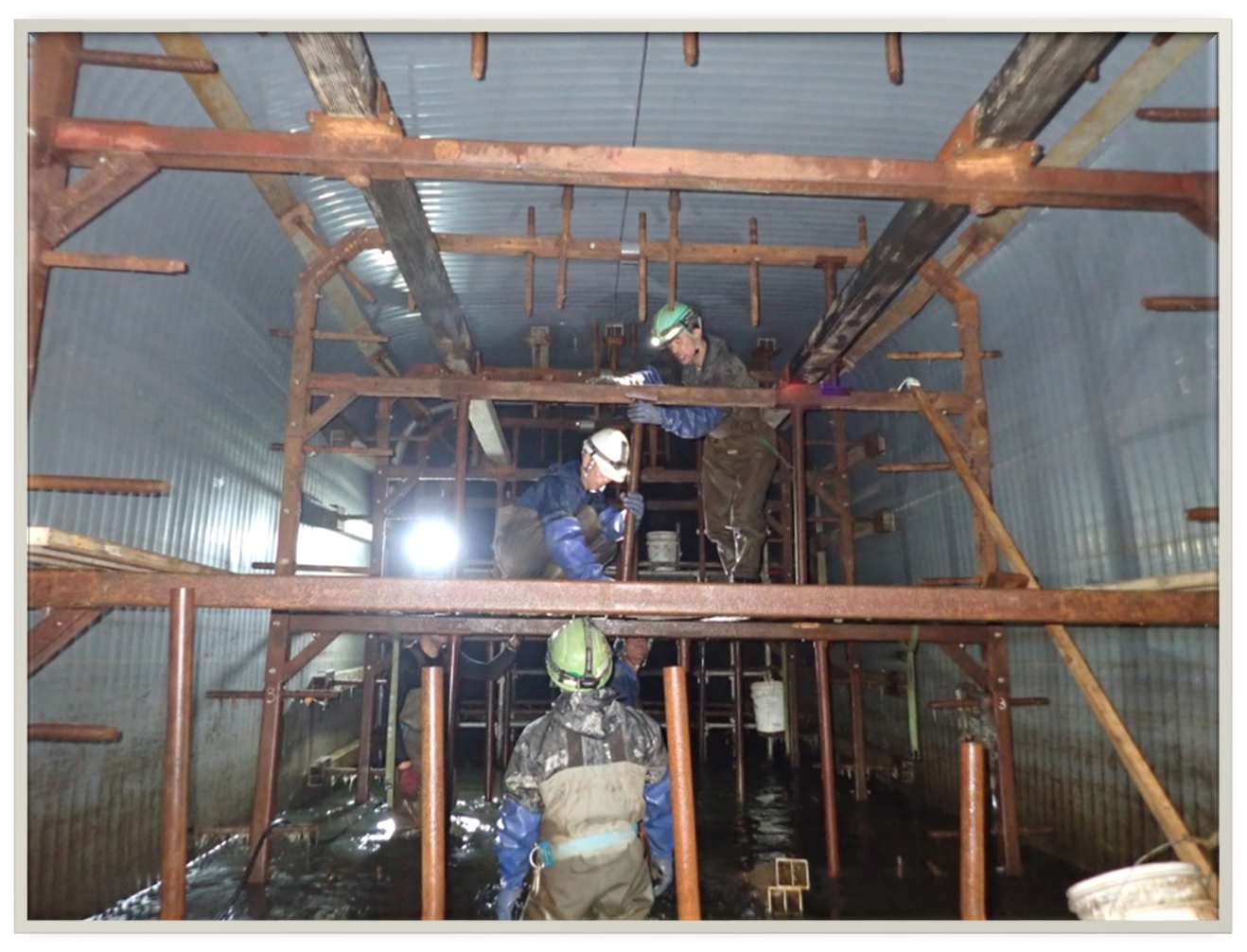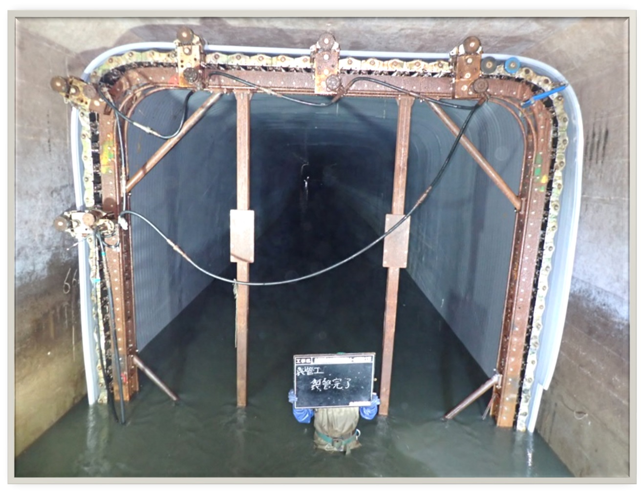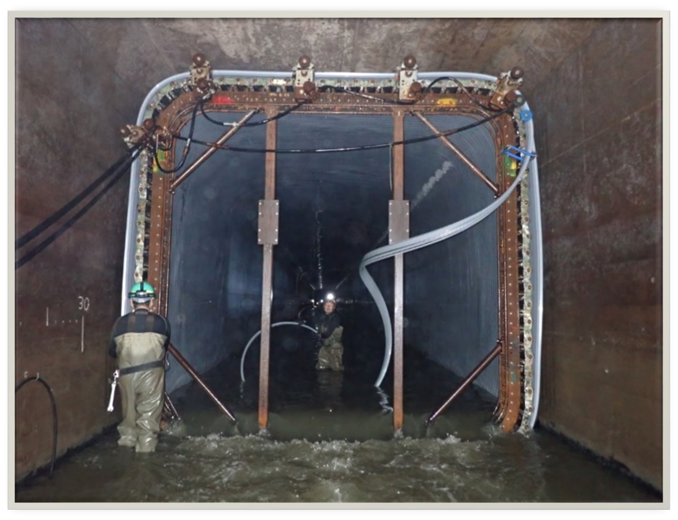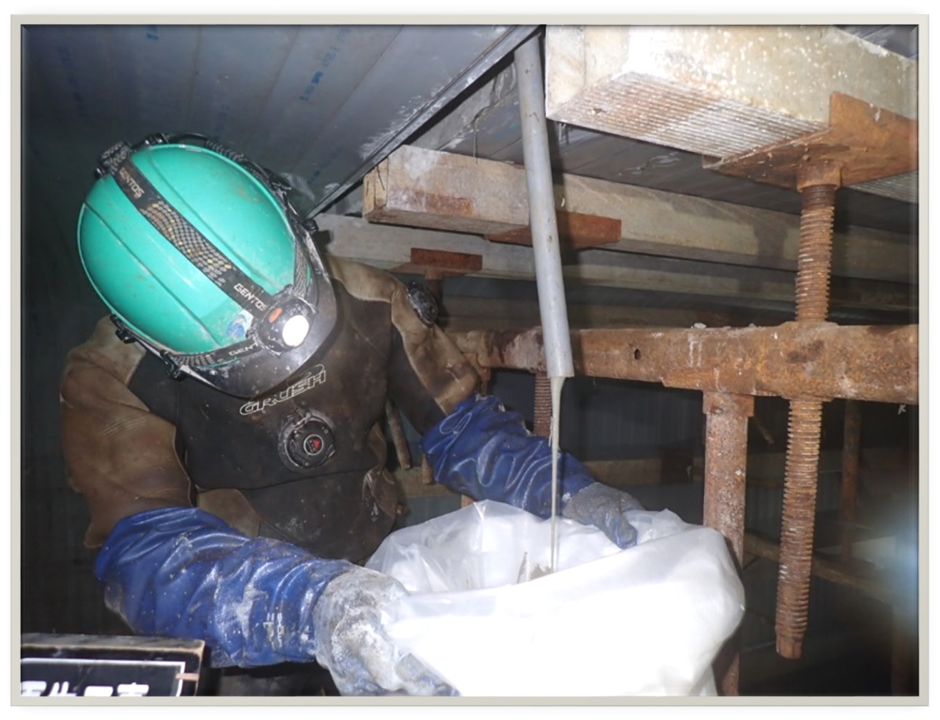 水が流れている管内での作業で足元がとても不安定ですが慎重な作業を心掛けています。