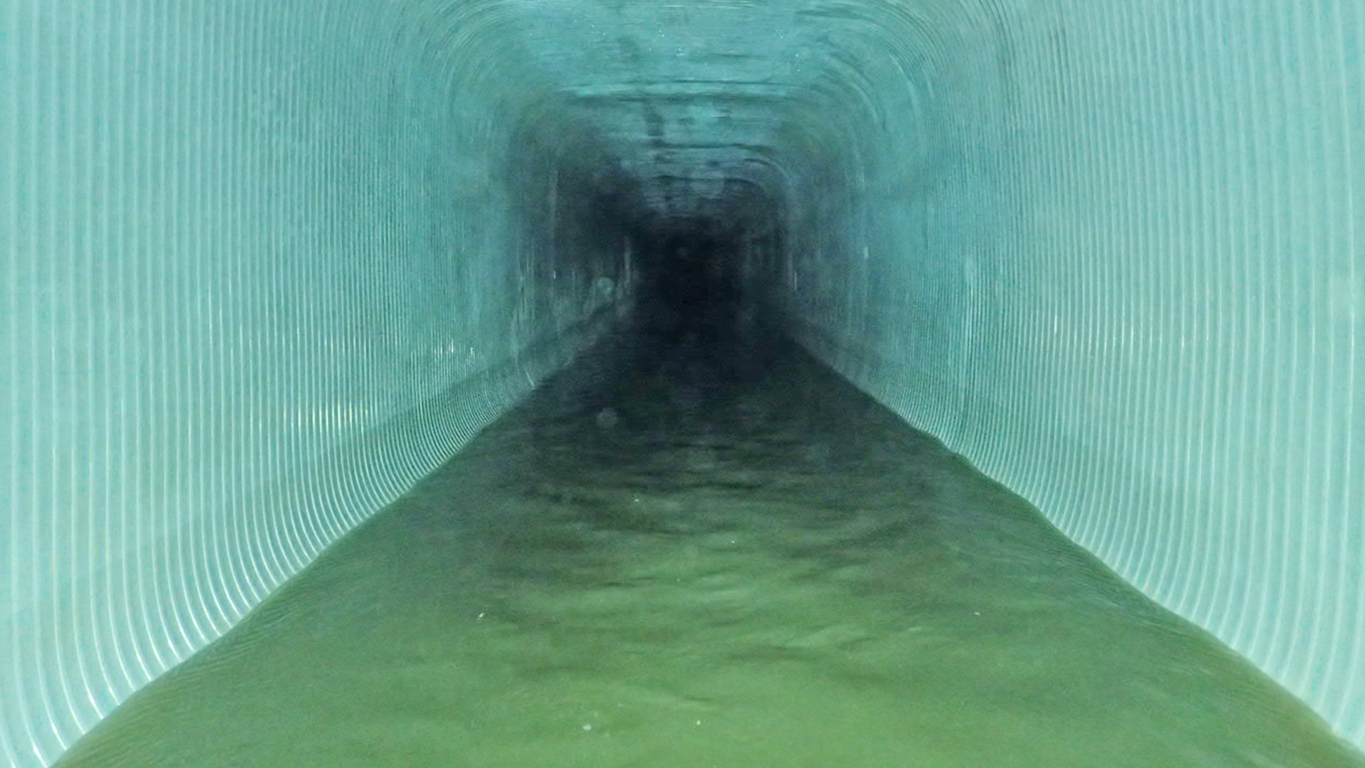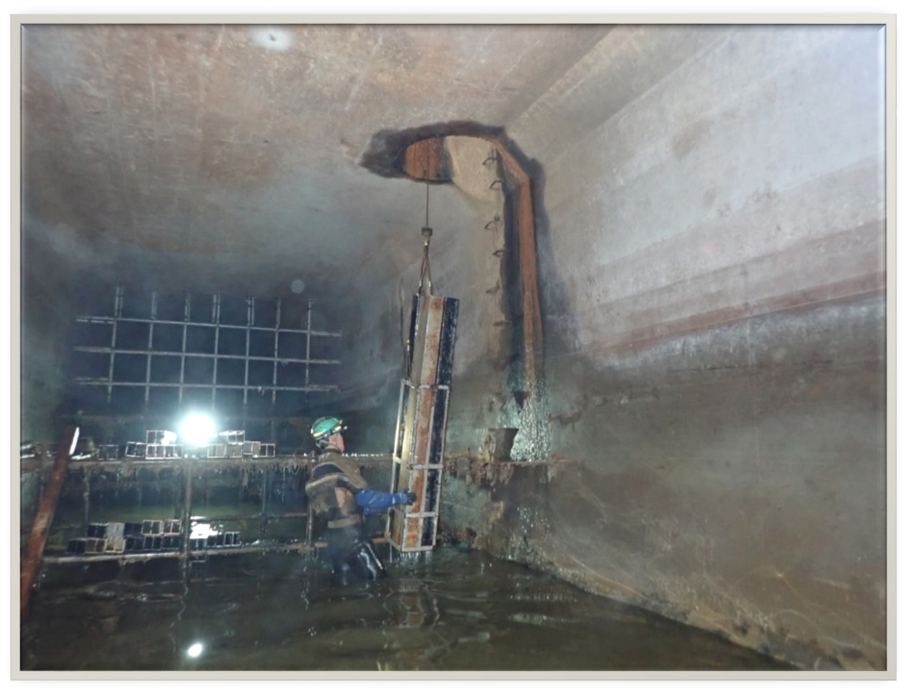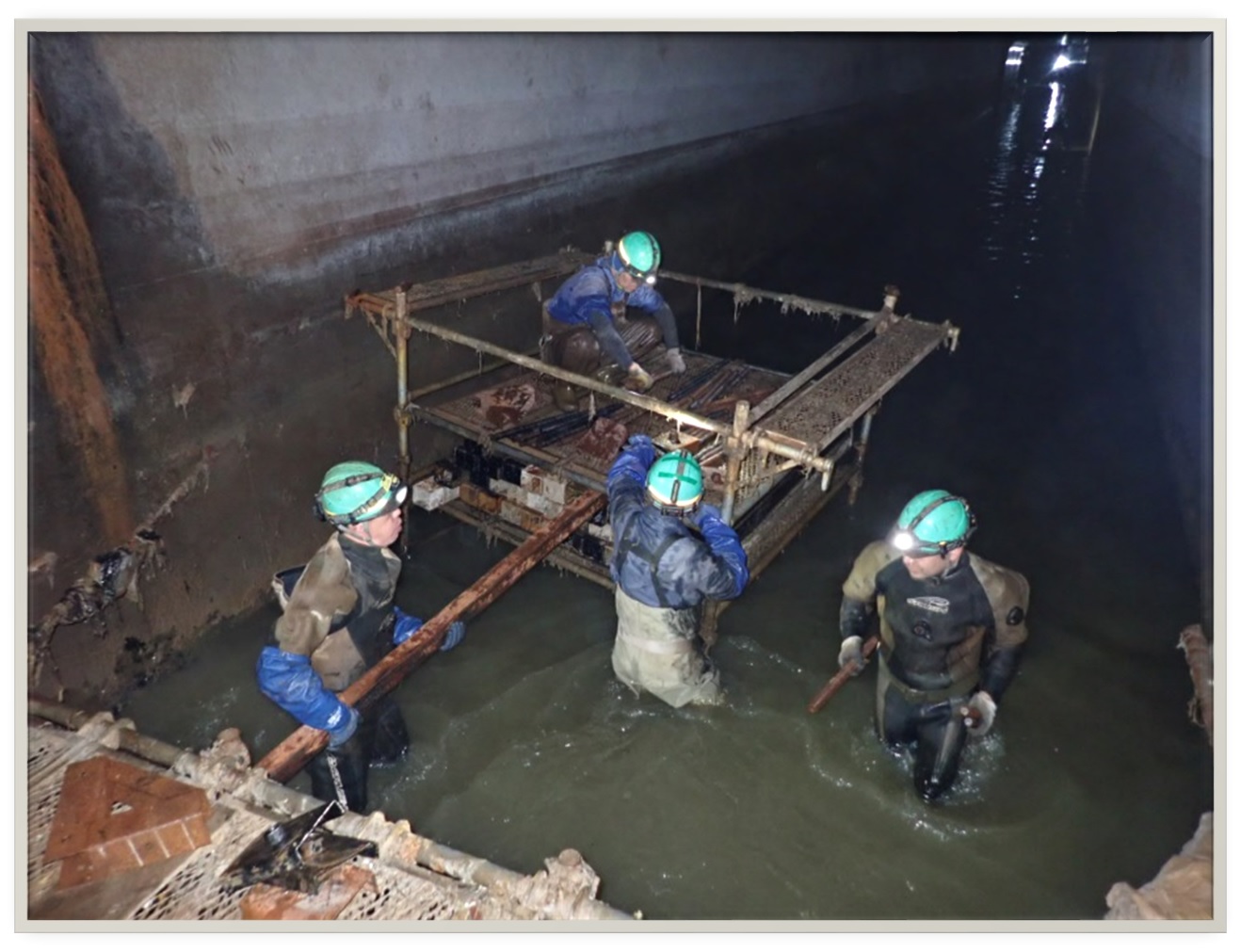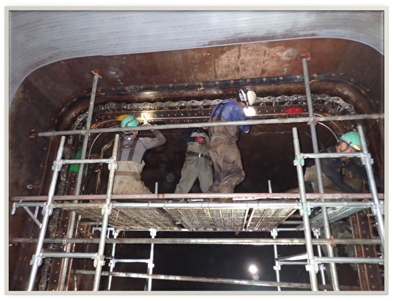 水が流れている管内での作業で足元がとても不安定ですが慎重な作業を心掛けています。