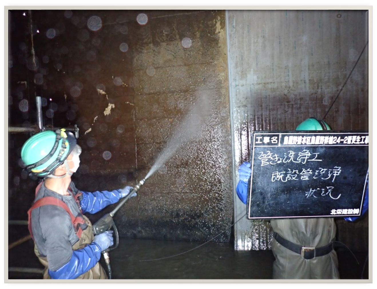 製管作業を開始する前に長年蓄積された水あか等の汚れを高圧洗浄機を使用して落としています。