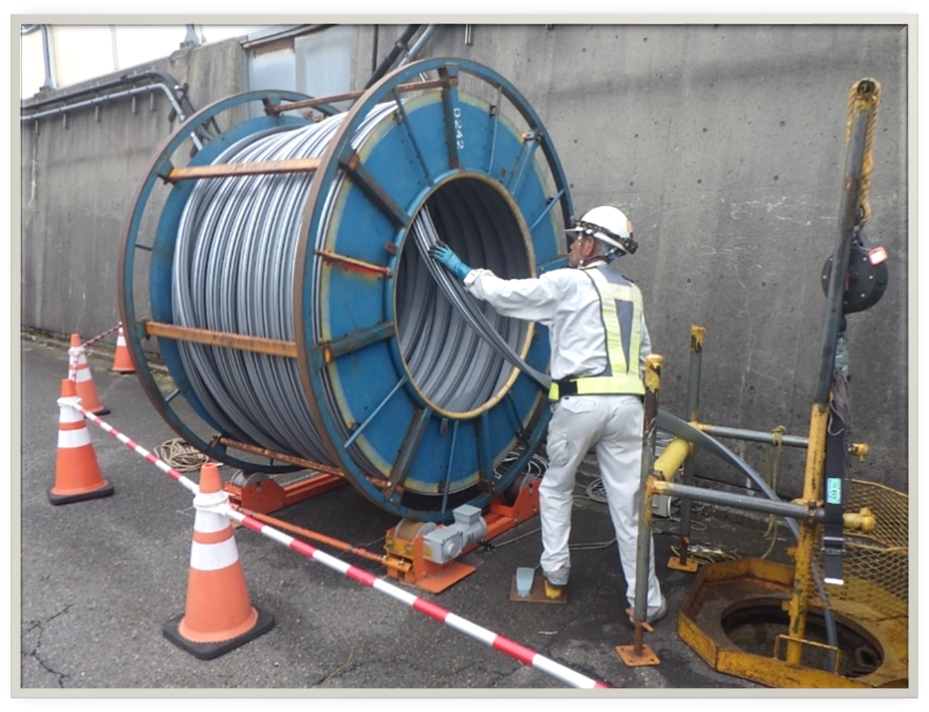 ドラムに装着したプロファイル(硬質塩化ビニル製)を地上のマンホールから管内へ送り込みます。