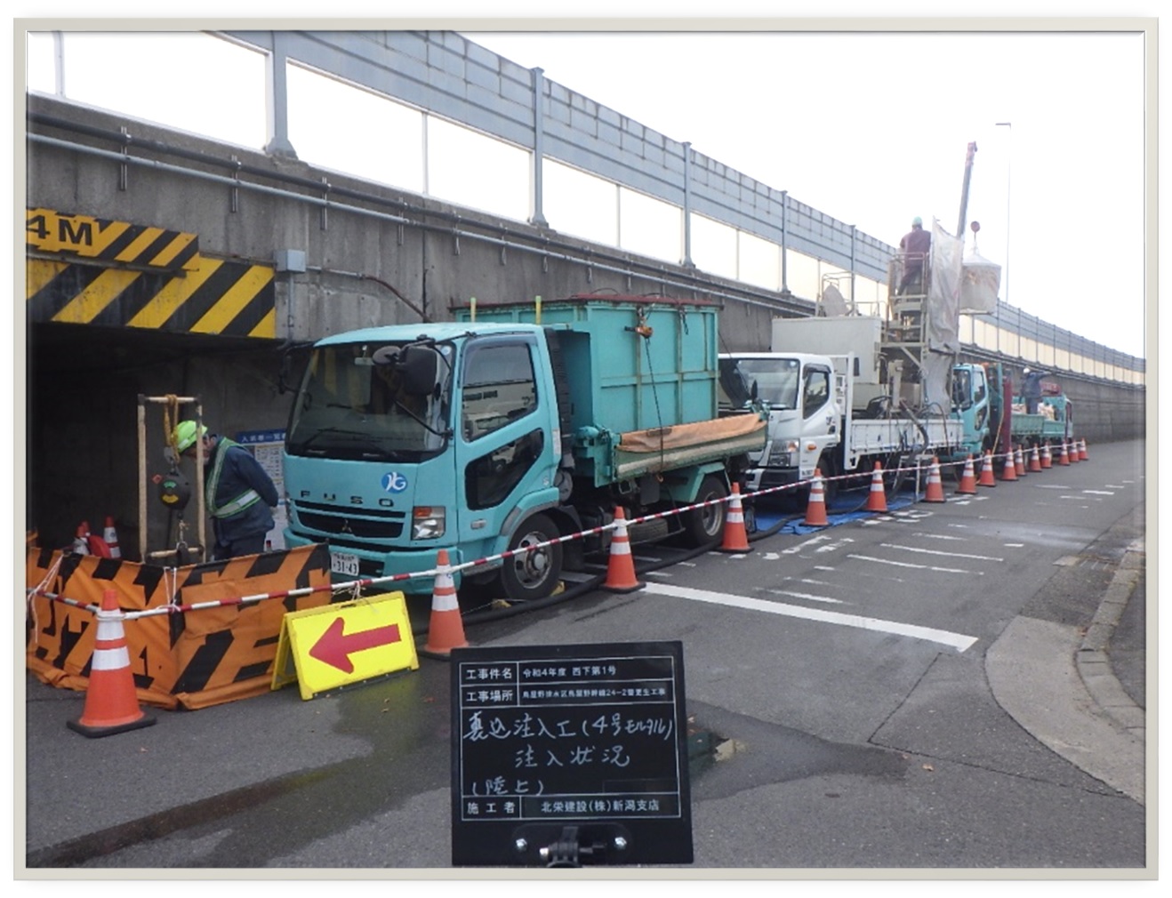 1番奧のクレーンの付いているトラックでモルタルを運び、真ん中の白いたくさん機材を乗せているトラックでモルタルを製造します。そこで作ったモルタルが管内へ送られていきます。黄緑色のヘルメットの人は地上監視員で管内水位は天候に左右されるのでいつでも天候の変化を管内作業員とコミュニケーションがとれる環境を整えてます。手前の箱の中は練り混ぜ水が入ってます。