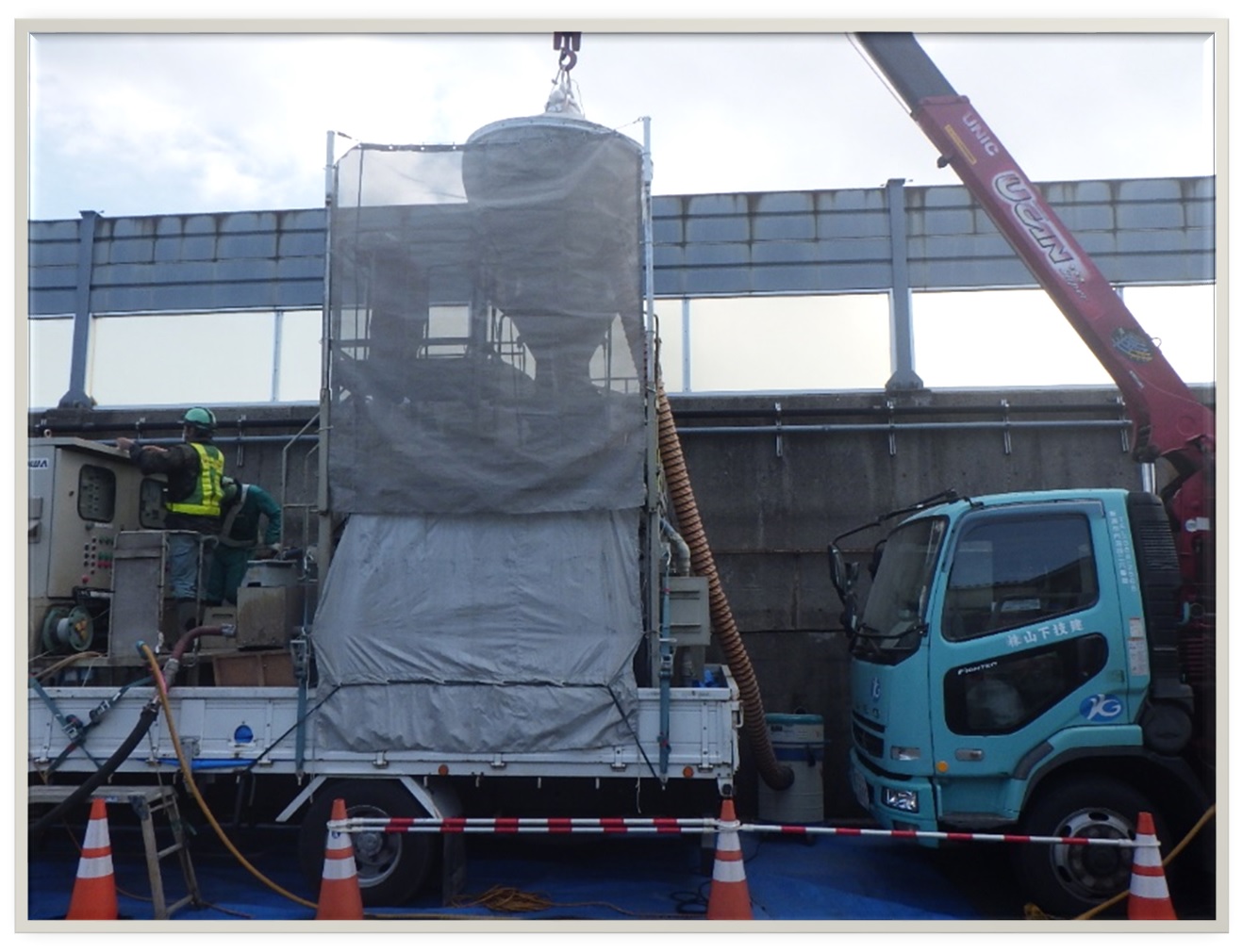モルタルを吊り上げ袋を破り投入する際に粉塵が舞い、近くにある車や建物が汚れてしまう可能性があるため、シートで覆い対策をしています。ちなみに黄色のホースは集塵機でモルタルの粉を吸って集めています。緑色のヘルメットの人と管内作業員はインターホンでつながっており、その時の作業の進捗状況などを話し合いながら慎重な作業で進めています。